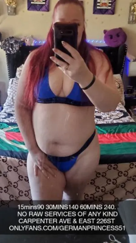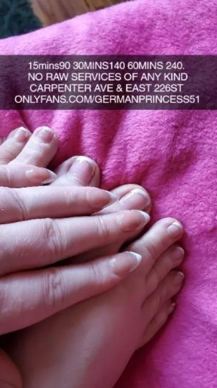 INCALL ONLY BRONX... . 25 & UP . .................. MY PHONE DON'T ALLOW SPAM NUMBER............. . . TAKE 2 TRAIN TO 225ST OR IF DRIVING EX.233ST............. ...... . CARPENTER AVENUE E 226ST NEAR BRONX BLVD ( NOT WHITEPLAINS RD) . ADDRESS WILL BE GIVEN WHEN U HAVE PARKED...... . 15MINS 90......... 30MINS 140............ 60MINS 240 2ROUNDS.............. ........ . STRAP ON PLAY 15MINS IS 125..... 15MINS VIDEO SESSION 70....... OUTFIT REQUESTS 20....... NO BBBJS ............ NO G.F.E ........... NO 3SUMS .......... NO COUPLE ............ . IG germanprincess53... Onlyfans/GERMANPRINCESS51.. Twitter sueannnmu.. SNAPCHAT sbunnny931... 7am to 7pm . IF U ARE MORE THEN 10 MINS LATE DON'T EXPECT ME TO BE AVAILABLE 420 FRENDLY ONLY