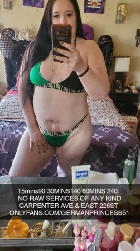 INCALLS ONLY BRONX ..... 25 and up.......... NO DEPOSIT NEEDED.... 1000% REAL AND REVIEWED...... . . CARPENTER AVE AND EAST 226ST .. NEAR BRONX BLVD ..(NOT WHITEPLAINS RD) ADDRESS WILL BE GIVEN WHEN U HAVE PARKED ... . 15MINS 90....... 30MINS 140.......... 60MINS 240 2ROUNDS ........... STRAP ON PLAYin 15MINS IS 125..... 15MINS VIDEO SESSION 70...... OUTFITS REQUESTS 20..... . NO BBBJS........ NO G.F.E............ NO 3SUMS............ NO COUPLE ..... NO RAW SERVICES OF ANY KIND ..... ... . IG GERMANPRINCESS53......... .. ONLYFANS.COM/GERMANPRINCESS51.... . 7 AM TO 7PM EVERY DAY 25 & UP.. If you are more than 10 minutes late you cannot expect me to be available I go by appointment only........